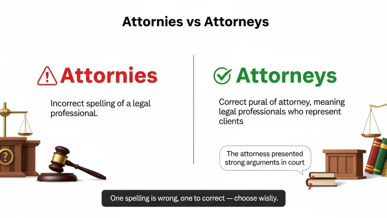 If you’ve ever typed “attornies” and wondered whether it was correct or a spelling mistake, you’re not alone. Many people get confused about attornies vs attorneys, especially because English plural rules can be tricky. This is a common spelling confusion, particularly for students, writers, and anyone searching for legal information online.
