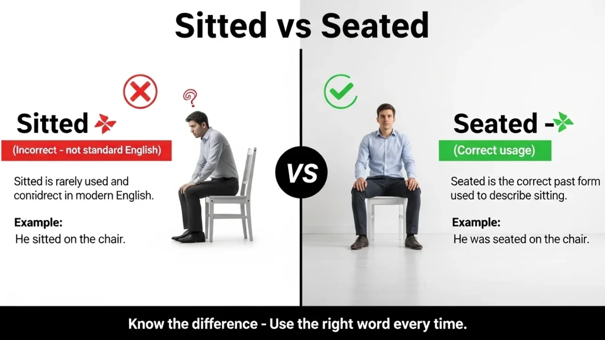 Remember this simple rule: Use “sat” for casual situations and “seated” for formal situations, and avoid using “sitted” completely. This small grammar difference can make your English sound much more natural and professional.